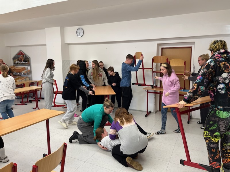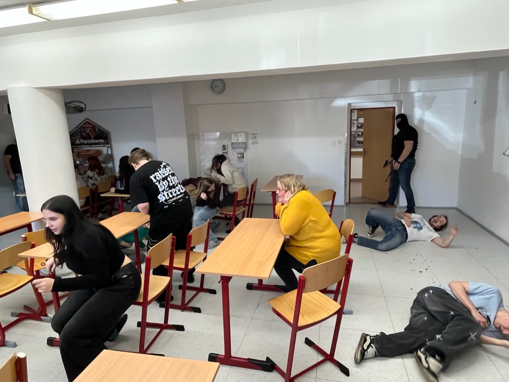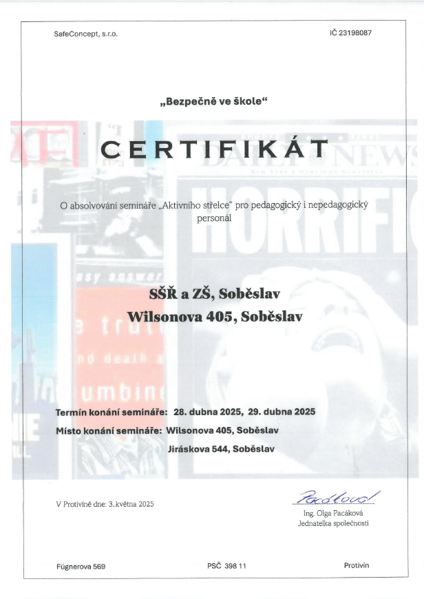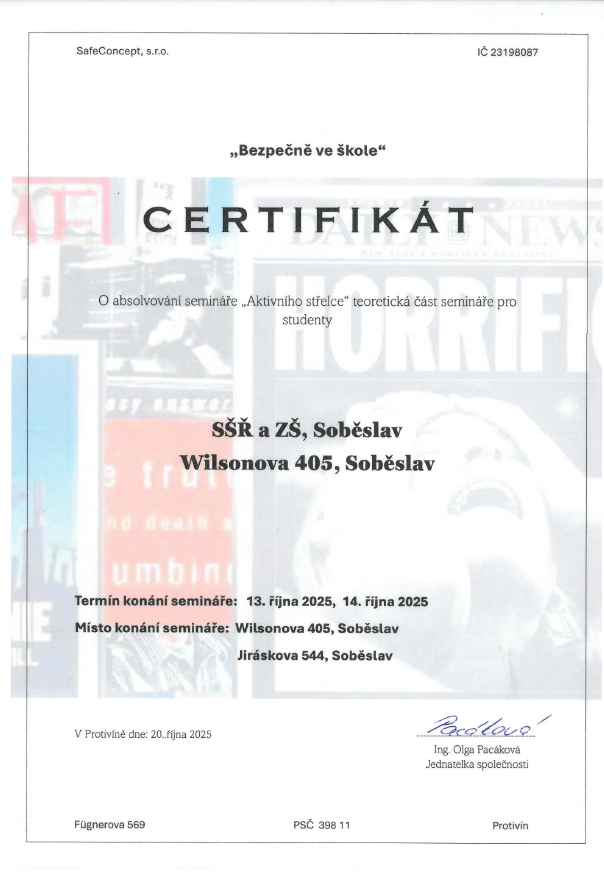 V průběhu dubna a října 2025 a ledna 2026 proběhla v naší škole intenzivní teoretická a praktická cvičení zaměřená na ochranu před ozbrojeným útočníkem. Zaměstnanci i studenti si pod vedením odborníků osvojili krizový postup a vyzkoušeli si reálný nácvik řešení krizových situací přímo ve třídě (barikádování, evakuace, poskytnutí a přivolání první pomoci). Tato preventivní opatření jsou klíčová pro zajištění bezpečného prostředí v a pro ochranu života a zdraví žáků a zaměstnanců.